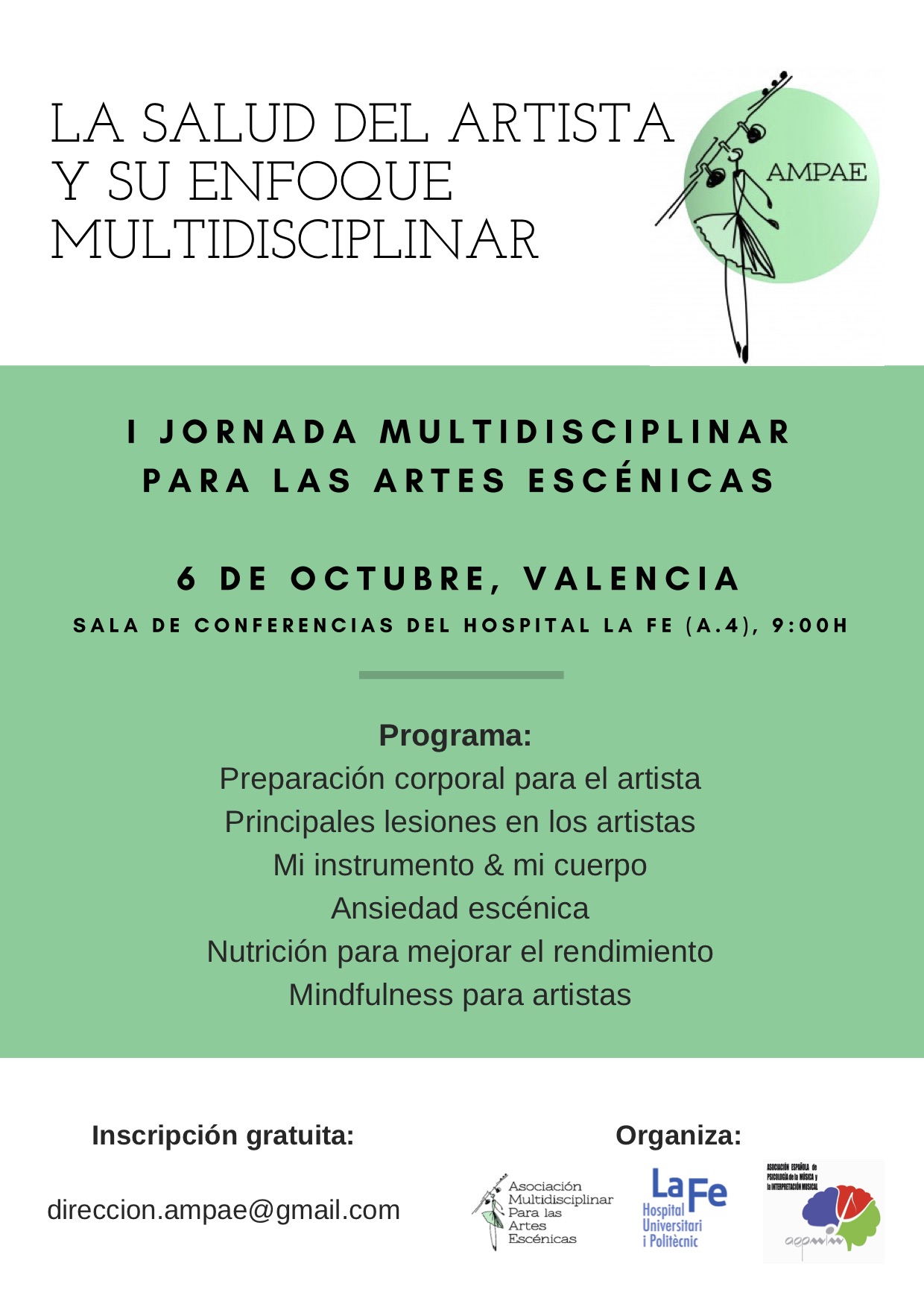 Des de l’Associació Multidisciplinària per a les Arts Escèniques (AMPAE) ens conviden a participar en la jornada «La salut de l’artista des d’un enfocament multidisciplinari«, que tindrà lloc el proper 6 d’octubre a la sala de conferències de l’hospital la Fe (A.4). Vos adjunte 2 pdf amb la informació i programa de la jornada.