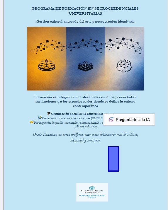 Nuestra socia y compañera de fatigas, ALMUDENA GONZÁLEZ BRITO nos invita a cfursar las MICROCREDENCIALES que organiza en la Universidad de La Laguna. Son 3 Microcredenciales: 1ª Microcredencial en Gestión cultural, ecologías patrimoniales y sistemas territoriales; 2ª Microcredencial en Mercado del arte, mecenazgo e innovación; y 3ª Microcredencial en Neuroestética aplicada y diseño de experiencias culturales.